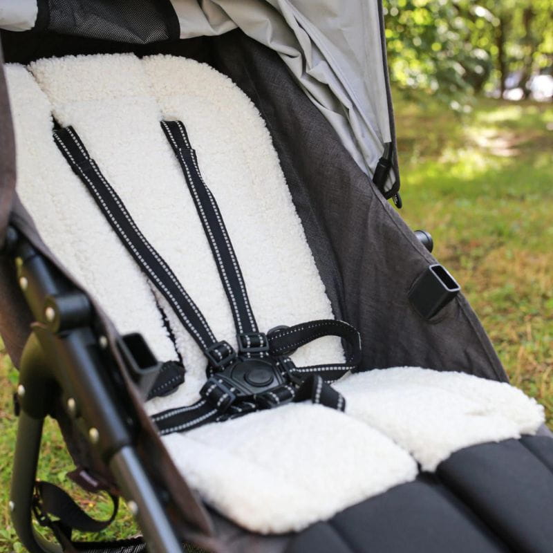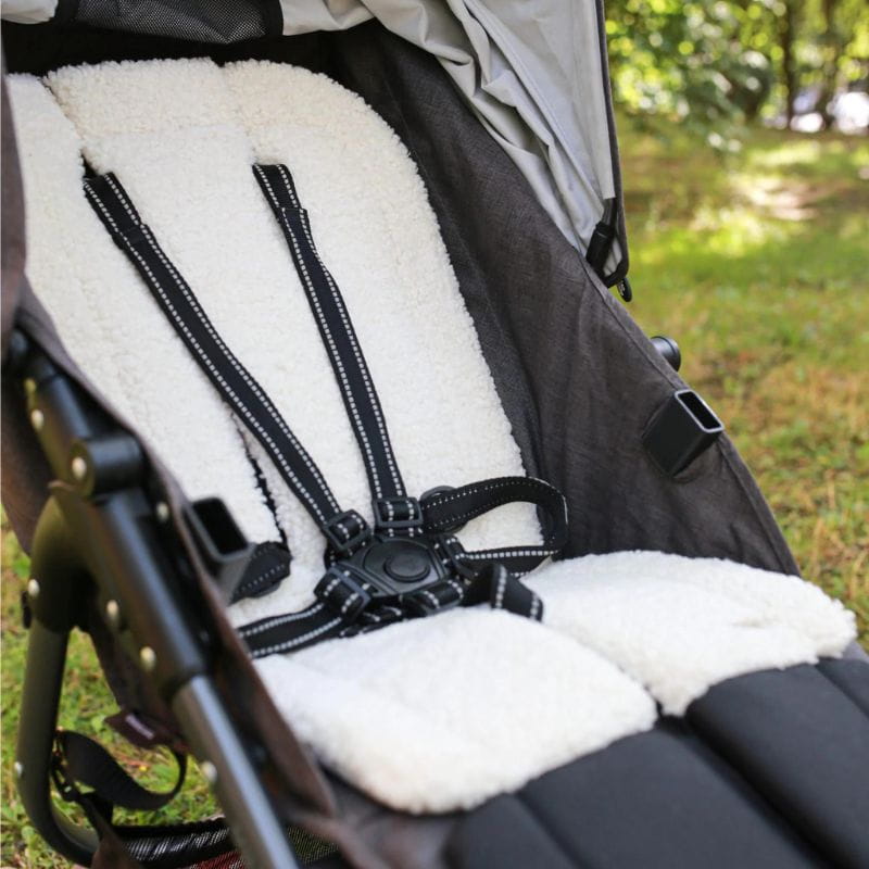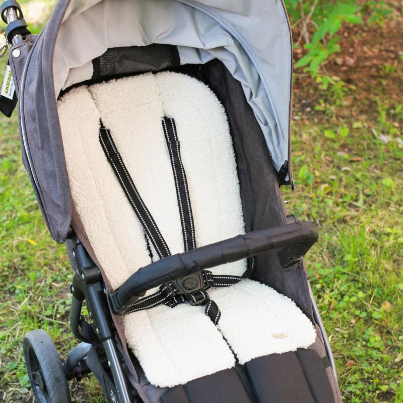 Das Kinderwagenpolster ist mit 3-Punkt- und 5-Punkt-Kinderwagen kompatibel, hat vertikale Löcher für die Gurte und eine Befestigung für ein Schmetterlings-Anti-Schock-Kissen.