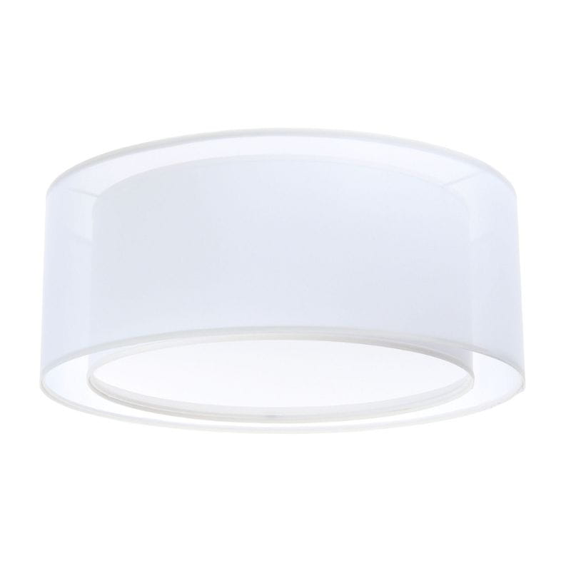 Der doppellagige Lampenschirm besteht aus halbtransparentem Stoff und weißem Kunststoff. Im Set ist auch eine Abdeckblende enthalten.
