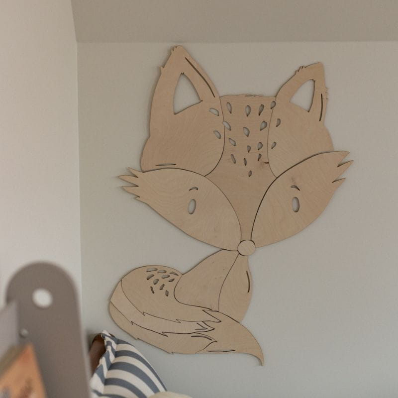 Der dekorative Fuchs an der Wand ist süß und fügt sich in viele verschiedene Räume ein. Sperrholzdekorationen können Innenräume mit Tapeten ergänzen oder als eigenständige Dekoration dienen. Sie sind einzigartig und verleihen Kinderzimmern in natürlichen Farben eine warme Note.