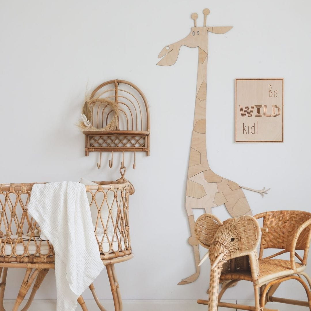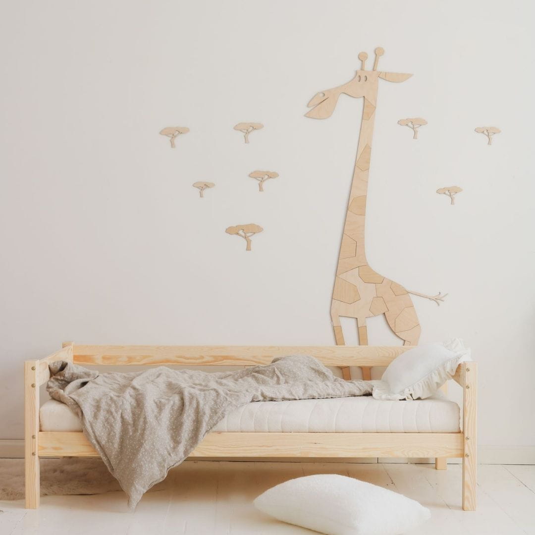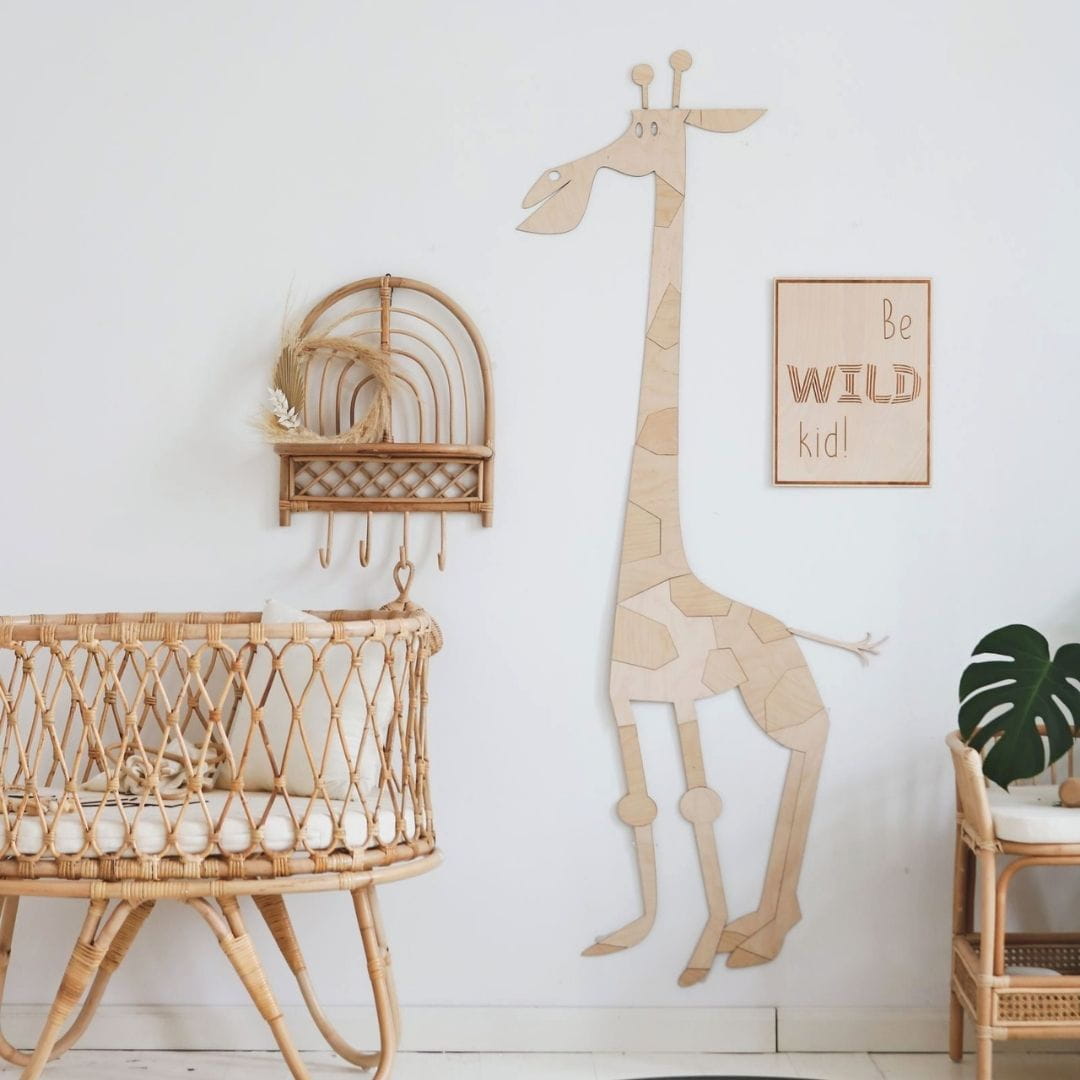 Die Giraffe besteht aus 3 mm dickem Birken-Sperrholz. Dank der natürlichen Beschaffenheit der Tiere können Sie sie leicht in jedes Kinderinterieur integrieren.