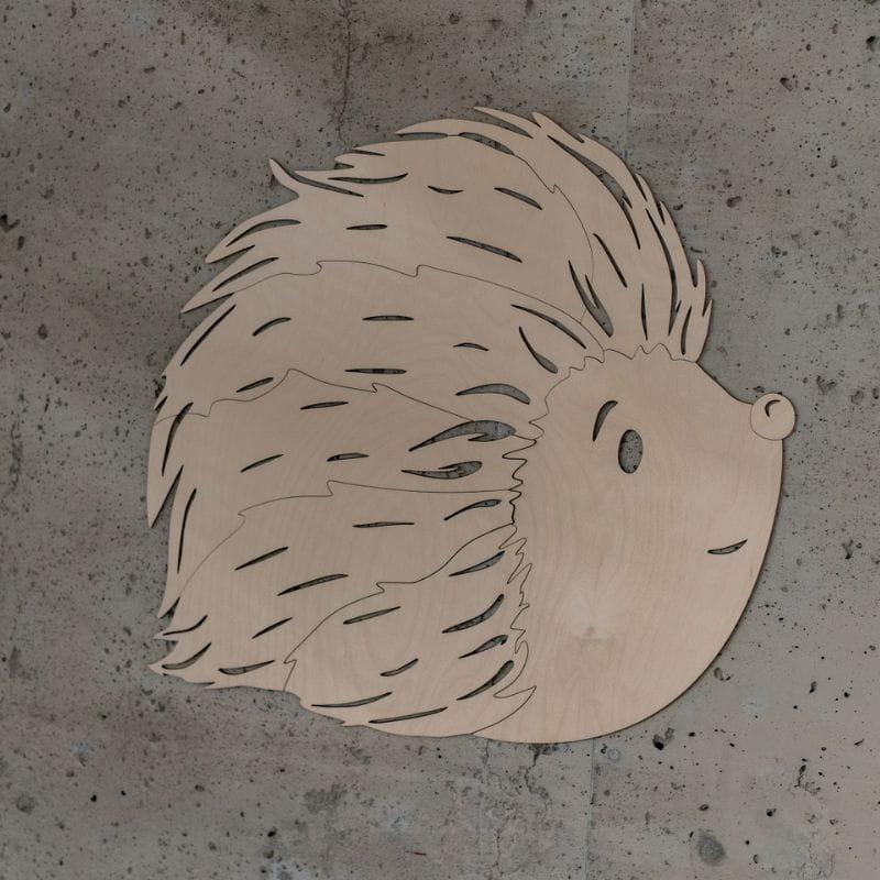 Der dekorative Igel an der Wand ist süß und fügt sich in viele verschiedene Räume ein. Sperrholzdekorationen können Innenräume mit Tapeten ergänzen oder als eigenständige Dekoration dienen. Sie sind einzigartig und verleihen Kinderzimmern in natürlichen Farben eine warme Note.