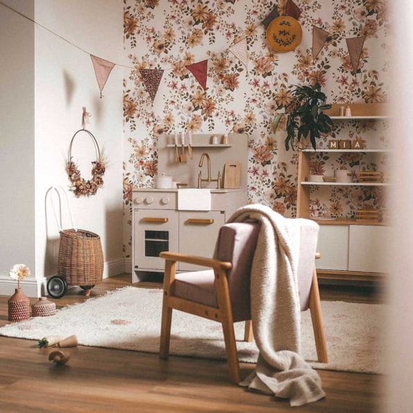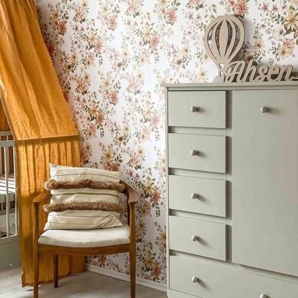 Tapete für das Mädchenzimmer im englischen Stil. Das wunderschöne florale Muster verleiht dem Raum einen einzigartigen Charakter.