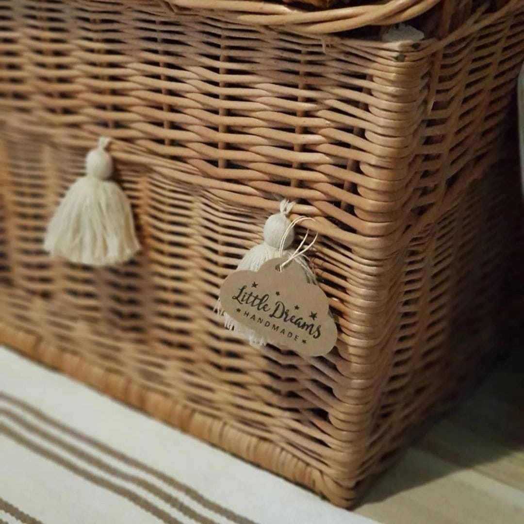 Ein wunderschönes Möbelstück zur Dekoration eines Kinderzimmers und mehr. Es dient als Sitzgelegenheit und als Aufbewahrungsort für Spielsachen. Am Sitz ist ein weiches Kissen aus angenehmem, naturfarbenem Musselin befestigt, das mit allergiefreiem Vliesstoff gefüllt ist. Die Korbbank ist mit Quasten verziert, die du an beliebiger Stelle befestigen kannst.