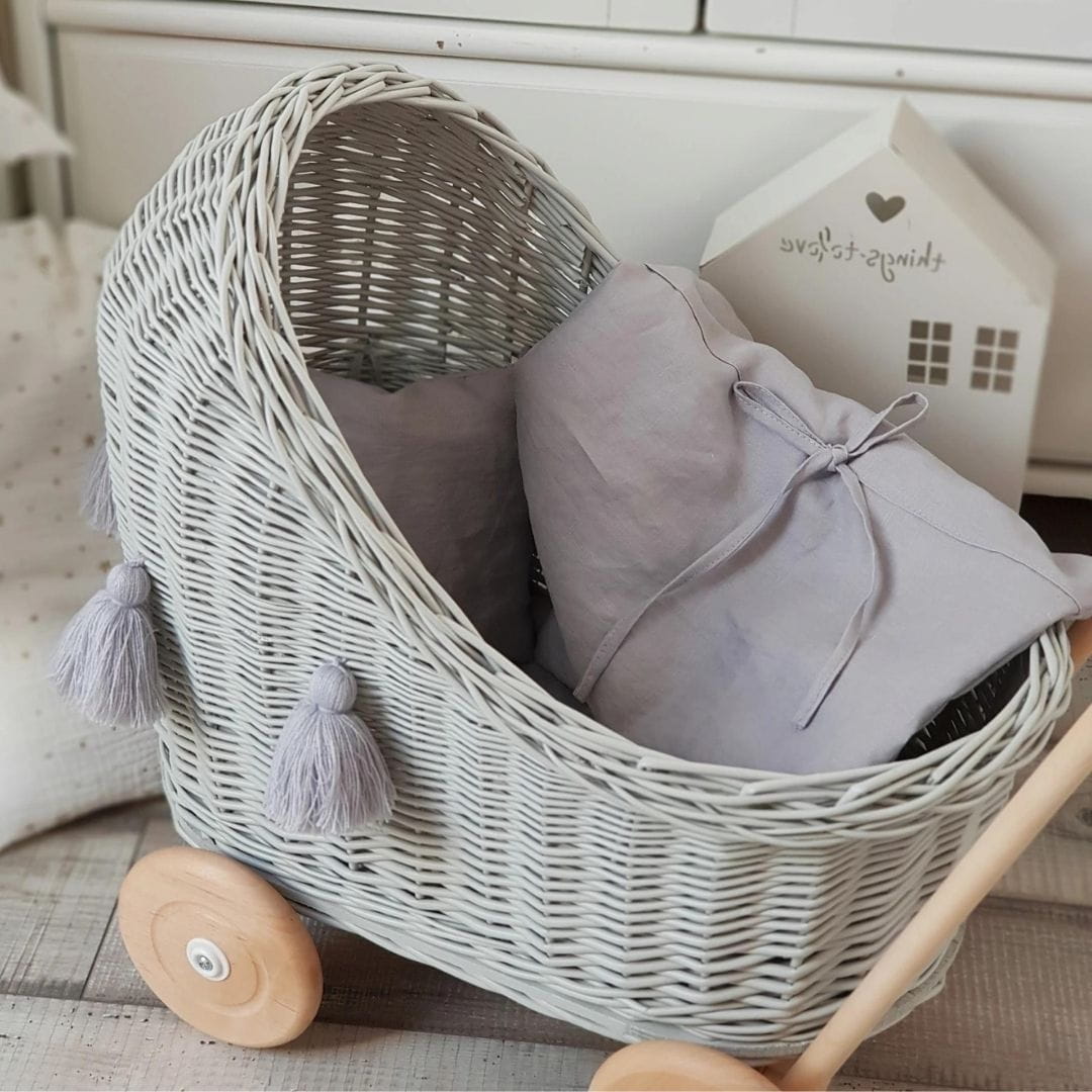 LITTLE DREAMS - WEIDENPUPPENWAGEN MIT BETTWÄSCHE GRAU