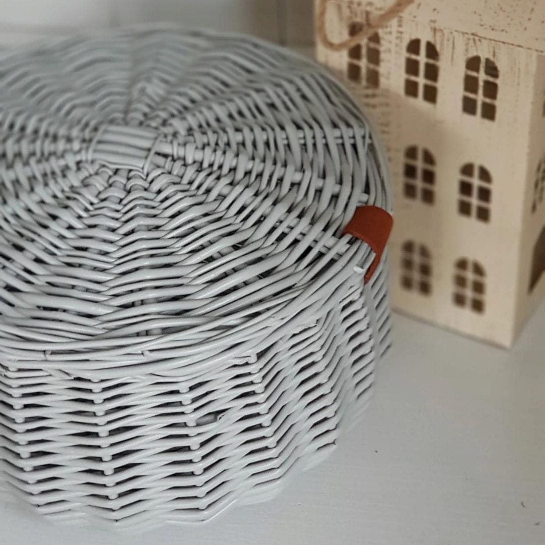 Der Korb ist vollständig handgefertigt aus hochwertiger Weide von polnischen Bauernhöfen. Er ist gestrichen mit einer speziellen ökologischen Farbe, die sehr widerstandsfähig gegen Beschädigungen ist.