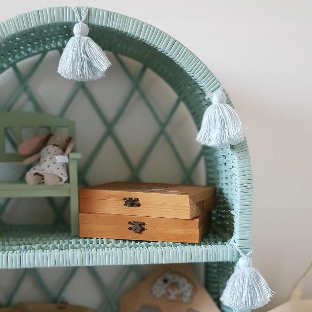Es schafft eine natürliche Atmosphäre im Kinderzimmer, hat aber auch eine praktische Anwendung – es kann als Bücherregal dienen, in die Regale passen Ihre Lieblingsspielzeuge oder Schulsachen. Am Regal sind fünf Quasten angebracht, die gelöst und an anderer Stelle befestigt werden können.