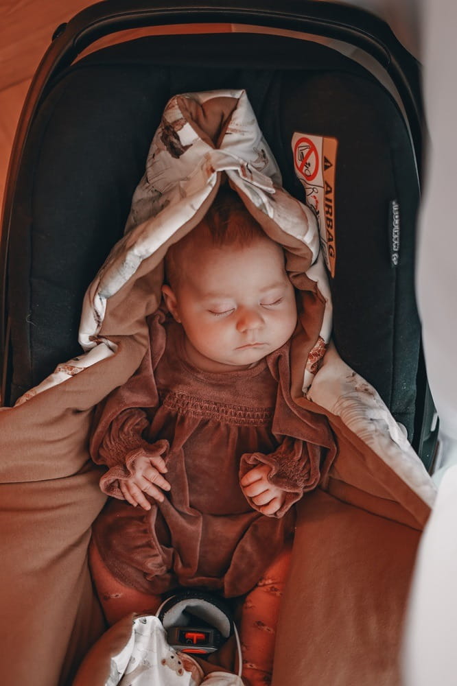 Die Decke ist mit Öffnungen für 3- und 5-Punkt-Sicherheitsgurte ausgestattet. Die langen vertikalen Klettverschluss-Schlitze ermöglichen eine einfache Anpassung an jeden Autositz. Sie wird mit einem breiten, verstellbaren Klettverschluss geschlossen und hat eine praktische Kapuze, die den Kopf des Babys sanft umhüllt und schützt.
