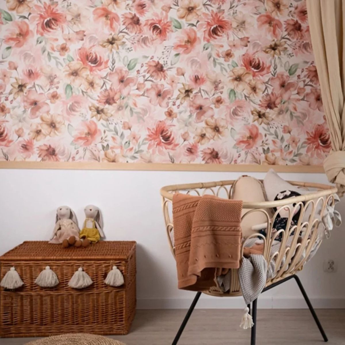Die warmen Farben der Blumen eignen sich perfekt für eine Wand neben dem Bett und schmücken den Ruhebereich wunderschön. Braune und rote Blumen in gedämpften Farbtönen und grüne Blätter sind eine harmonische Komposition für einen Teenager-Romantiker, für ein Mädchen, das gerne Zeit im Garten verbringt. Basierend auf einem klassischen, sich wiederholenden Muster in einer modernen grafischen Form aus aquarellierten Blütenständen. Wir empfehlen, diese Blumentapete im Retro-Stil anzuordnen, den oberen Teil der Wand über der Täfelung, über den hohen Wandsockeln. Sie können nur einen Tapetenstreifen verwenden und der Effekt wird großartig sein.