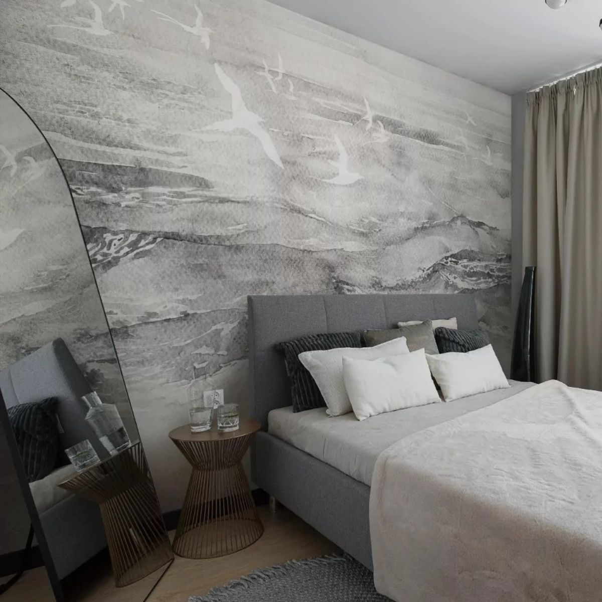 Die Tapete mit Möwen und dem Meer bringt Urlaubsstimmung in das Interieur. Wunderschön ausgewählte Farben passen sowohl in das Zimmer eines Jungen als auch in das Zimmer eines Mädchens.