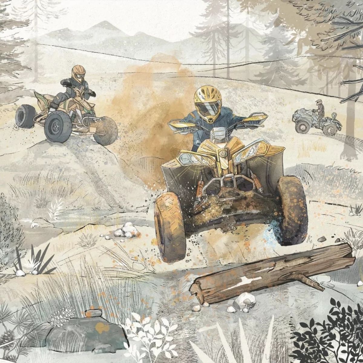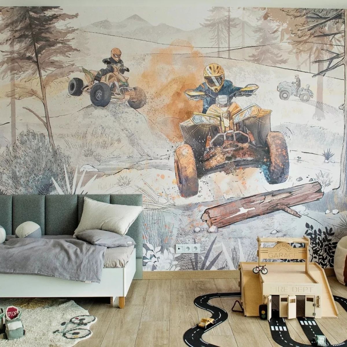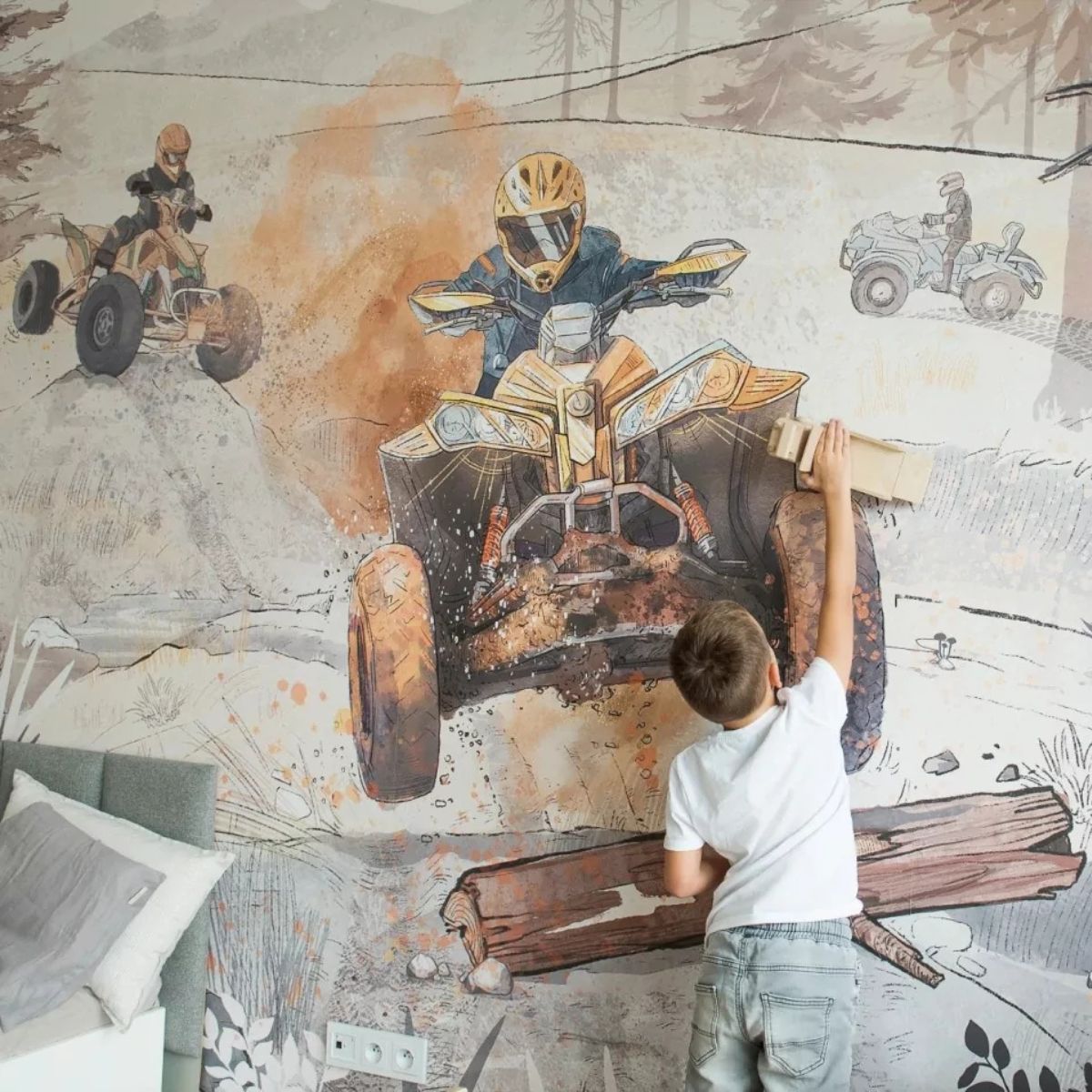 Ein ungewöhnliches Tapete mit Quads ist ein Vorschlag für etwas ältere Jungen. Das perfekte Muster für Fans von Adrenalin und Motorisierung.
