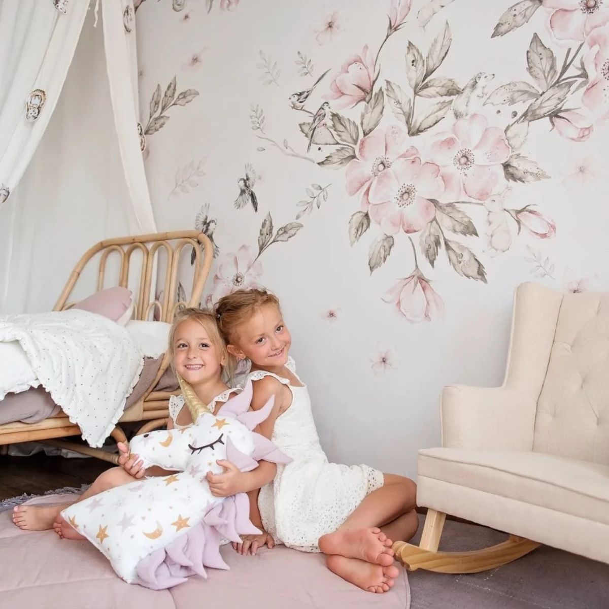 Blumen sind ein zeitloses Muster. Die Kindertapete mit großen Rosen zeigt ein erheblich vergrößertes und beeindruckendes Pflanzenmotiv, das den kleinen Träumer das Gefühl vermittelt, wie ein Schmetterling auf einer Wiese zu fliegen. Der WOW-Effekt für Eltern und die verträumten Augen des Kindes – gibt es etwas Besseres?