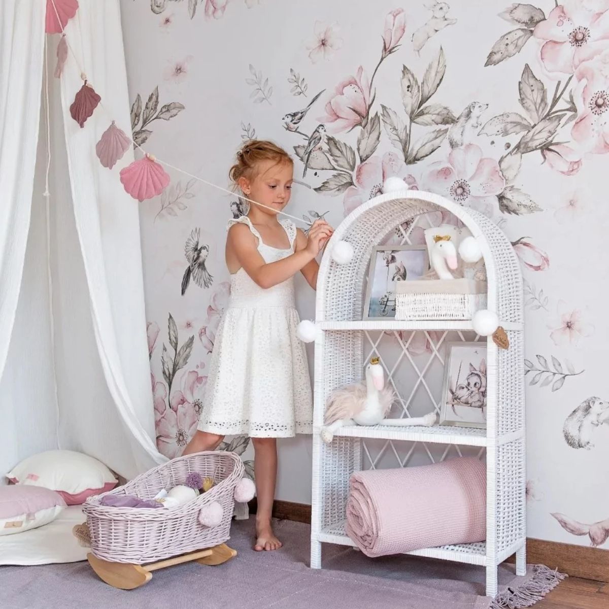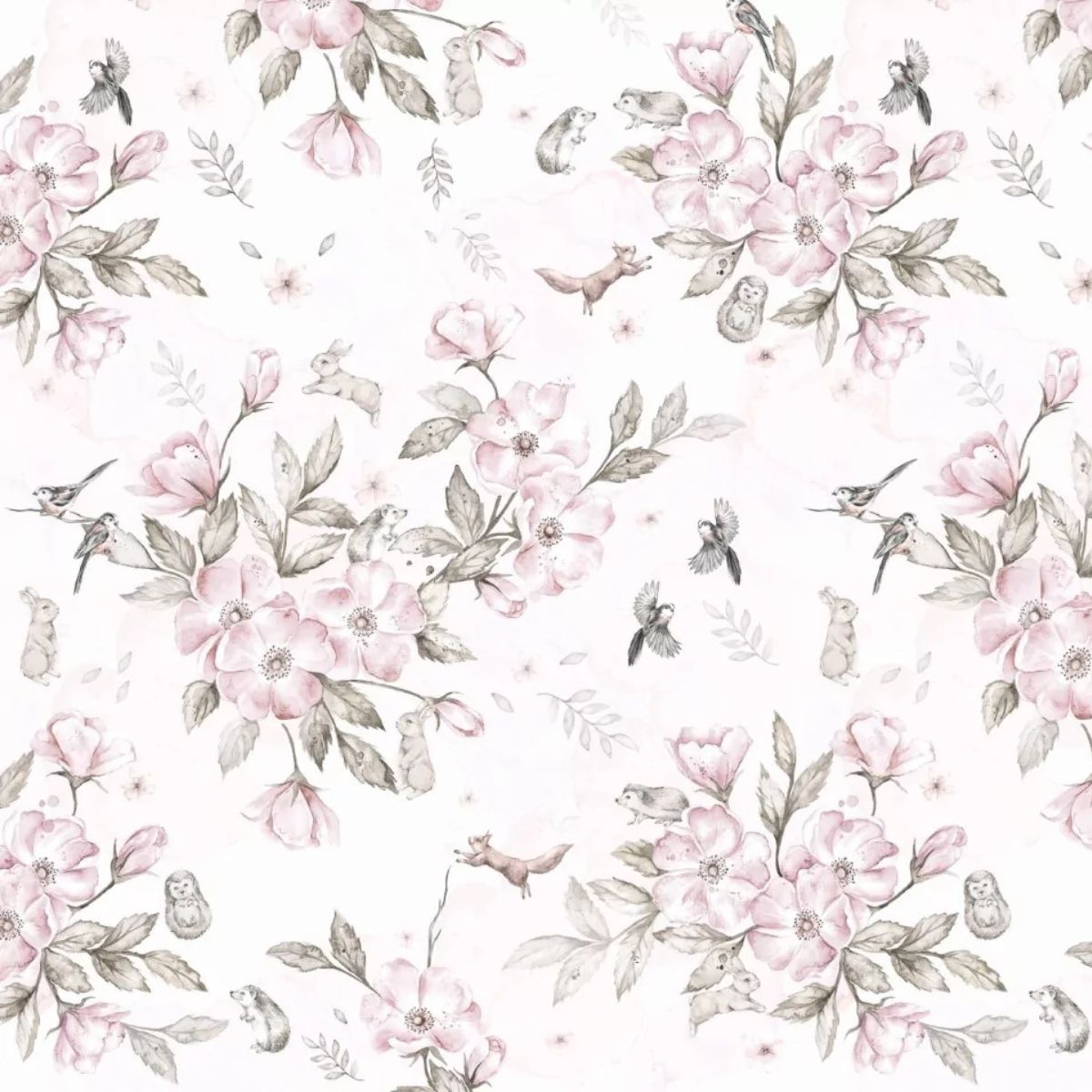 Die Kindertapete „Rosengarten“ zeigt riesige Blüten der wilden Rose. Pastelltöne, zarte rosa Pinselstriche im Aquarellstil verleihen dem Raum einen besonderen Charme. Dies ist typisch eine Kindertapete. Unter den großen Blumen lässt sich ein Hase entdecken, ein bunter Vogel sitzt auf einem Zweig, während andere fröhlich durch die Luft fliegen. Auch ein Eichhörnchen springt zu einem neuen Ort. Die harmonische Farbzusammenstellung beruhigt die Augen. Die Bewegung der Tiere auf der Tapete verleiht dem gesamten Interieur Dynamik. Die wunderschöne Darstellung der Natur ist beeindruckend.