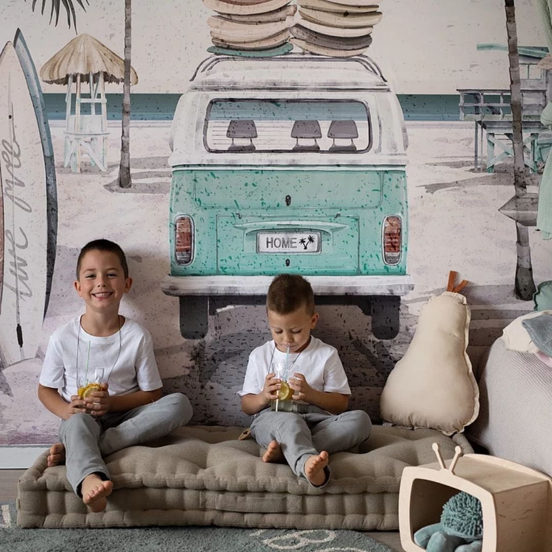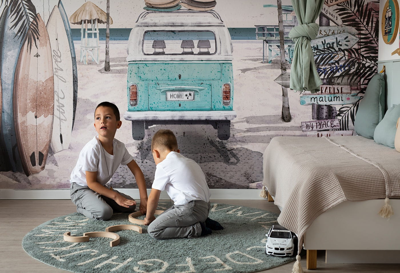 Die tolle Summer Vibes-Tapete für Kinder weckt die schönsten Urlaubserinnerungen! Retro-Van und Surfbretter, umgeben von Palmen und dem Hintergrund des Ozeans, sind ein Design, das sowohl im Jungen- als auch im Mädchenzimmer gut funktioniert.