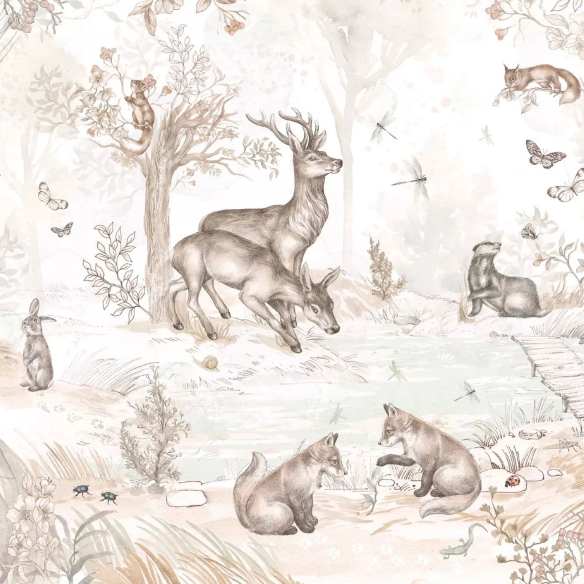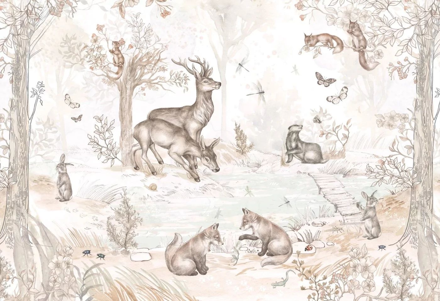 Eine Tapete für ein Kinderzimmer mit Waldtieren ist eine wundervolle Waldwelt mit Bäumen und Tieren, die bei Kindern beliebt sind: Hirsche, Füchse, Eichhörnchen und viele andere. Die Waldtapete Malumi für das Kinderzimmer ist in zarten Farben gehalten und eignet sich daher perfekt für natürliche Innenräume.