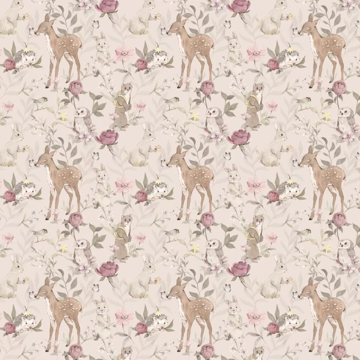 Kindertapete Woodland Girls sind beliebte Waldtiere auf leicht grauem Hintergrund.