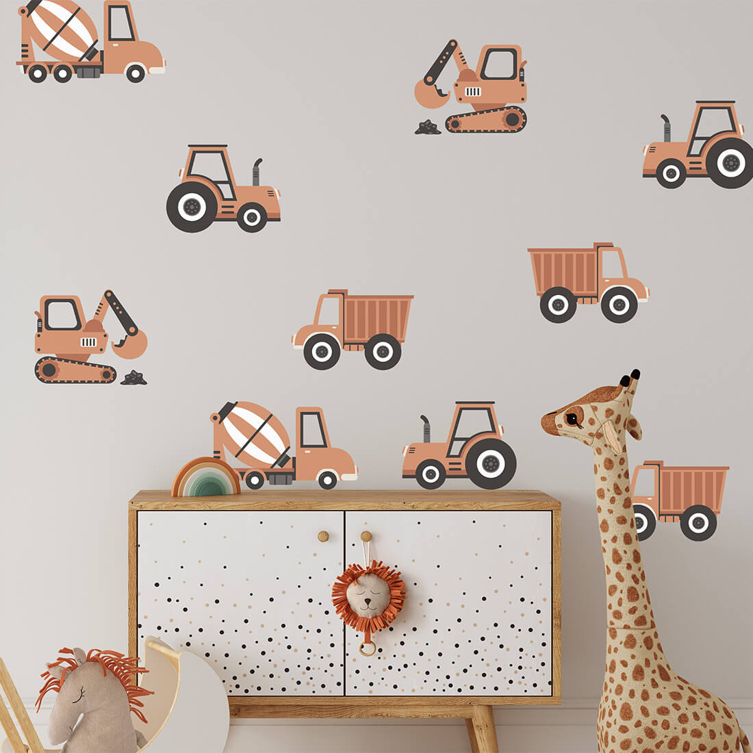 Verwandeln Sie das Zimmer Ihres Kindes in eine echte Baustelle mit einer Reihe von Aufklebern mit Baufahrzeugen.