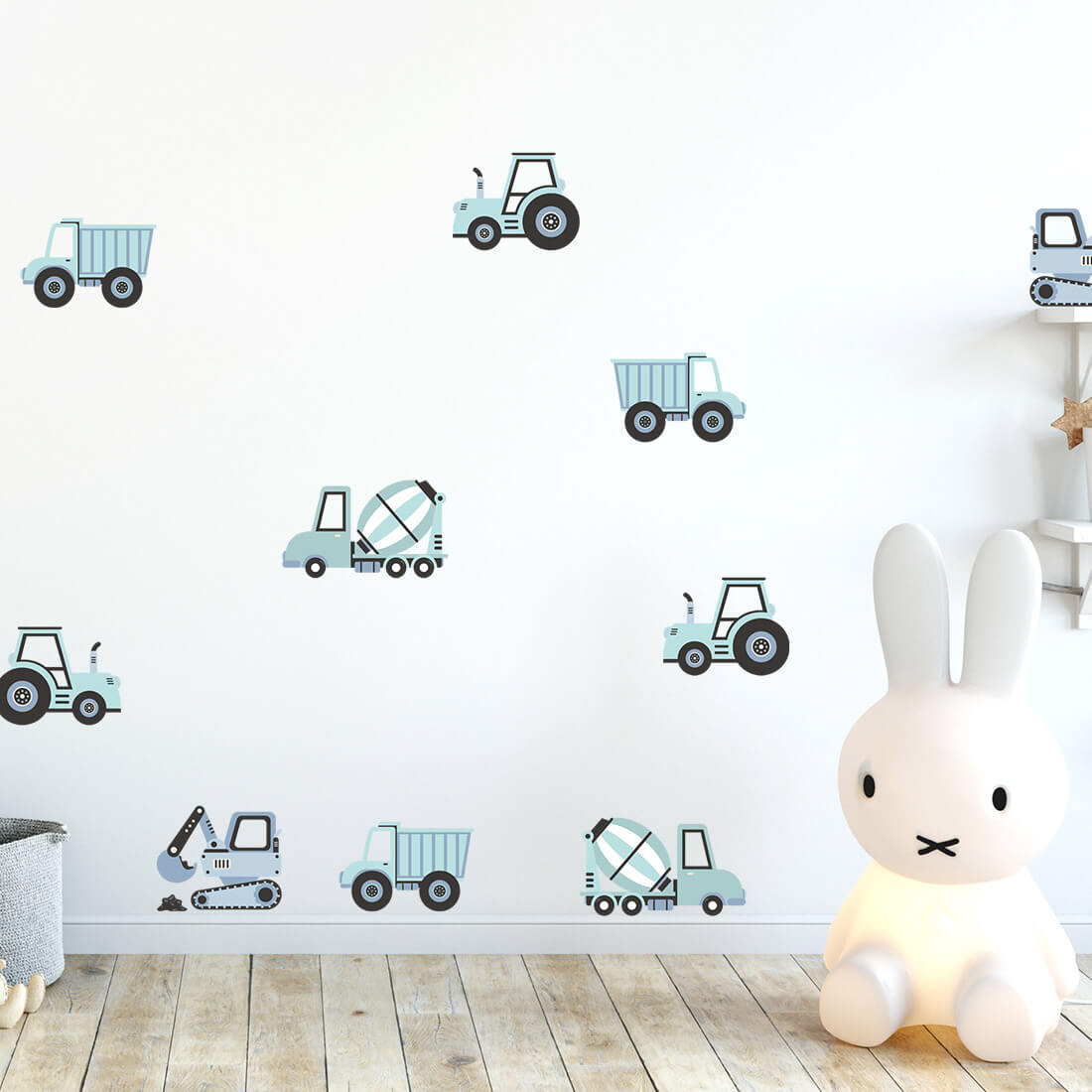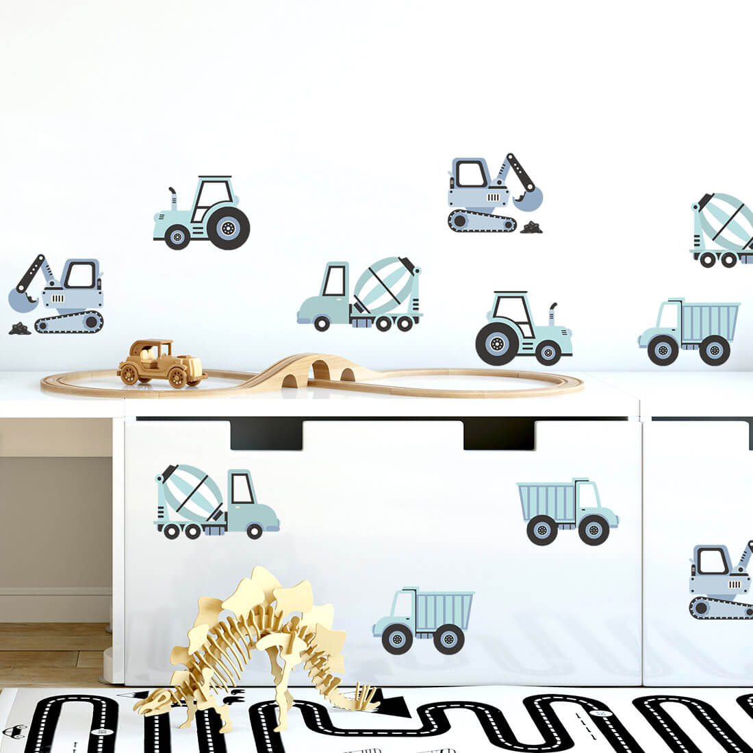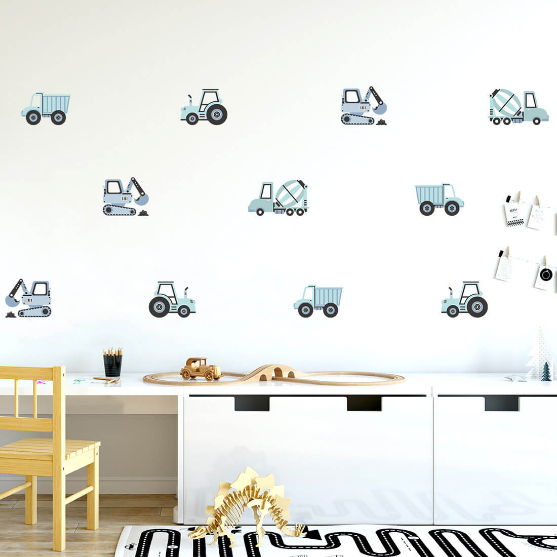 Verwandeln Sie das Zimmer Ihres Kindes in eine echte Baustelle mit einer Reihe von Aufklebern mit Baufahrzeugen.