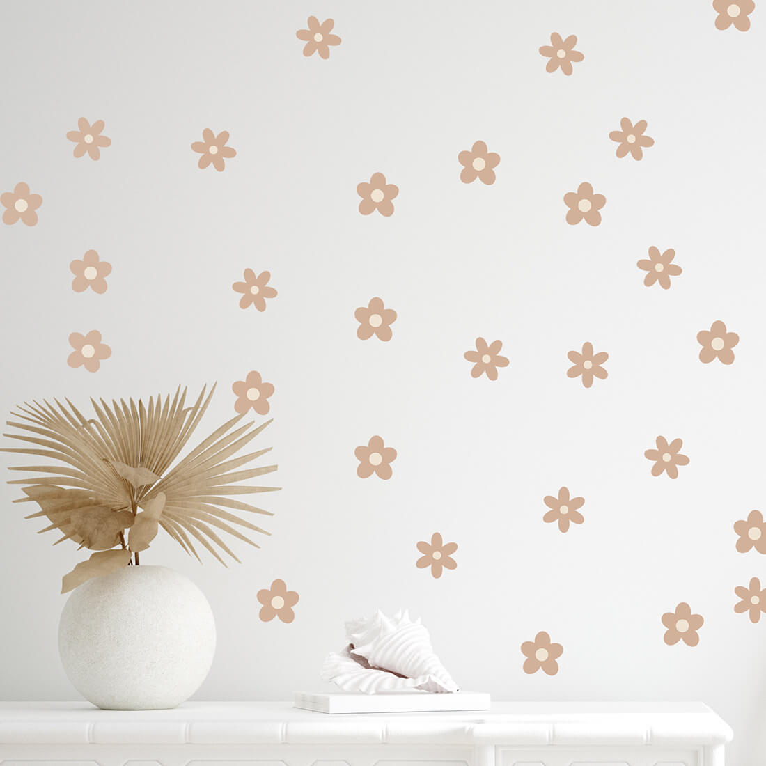 Ein Set von Gänseblümchen-Wandaufklebern (59 Stück) kann frei an der Wand arrangiert werden und erzeugt einen Tapeteneffekt. Die Blumen sind in zwei Formen und zwei Größen erhältlich. Sie wurden für alle Liebhaber zarter Motive und natürlicher Beigefarben entworfen. Durch ihre einzigartige Form sind sie perfekt für Kinderzimmer im Boho-Stil geeignet.