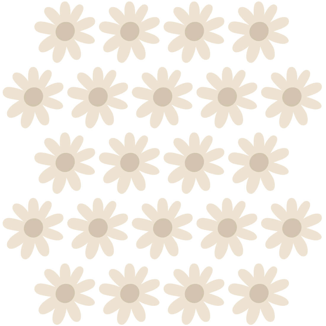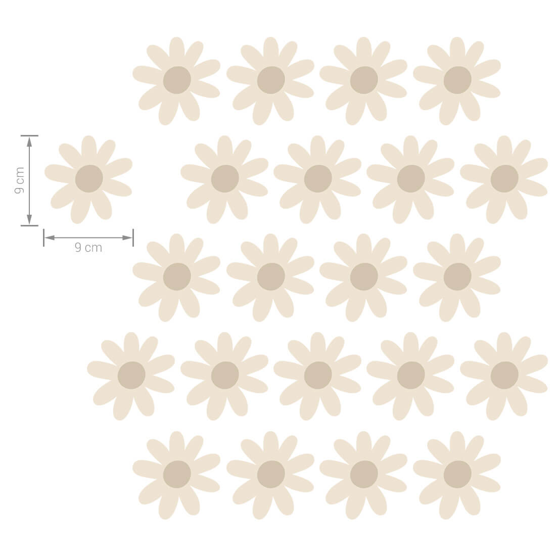 Ein Set von Gänseblümchen-Wandaufklebern (22 Stück) kann frei an der Wand arrangiert werden und erzeugt einen Tapeteneffekt. Die Blumen sind in zwei Formen und zwei Größen erhältlich. Sie wurden für alle Liebhaber zarter Motive und natürlicher Beigefarben entworfen. Durch ihre einzigartige Form sind sie perfekt für Kinderzimmer im Boho-Stil geeignet.