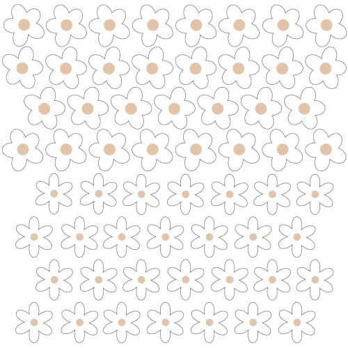 Ein Set Gänseblümchen-Wandaufkleber (59 Stück) kann frei an der Wand angeordnet werden und erzeugt einen Tapeteneffekt. Die Blumen gibt es in zwei Formen und zwei Größen. Sie wurden für alle Fans zarter Motive und natürlicher Beigetöne geschaffen. Dank ihrer einzigartigen Form eignen sie sich perfekt für Kinderzimmer im Boho-Stil.