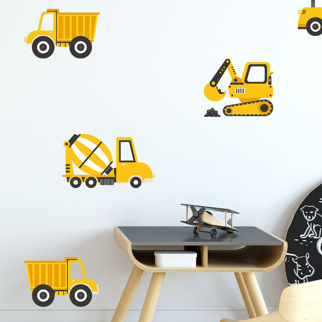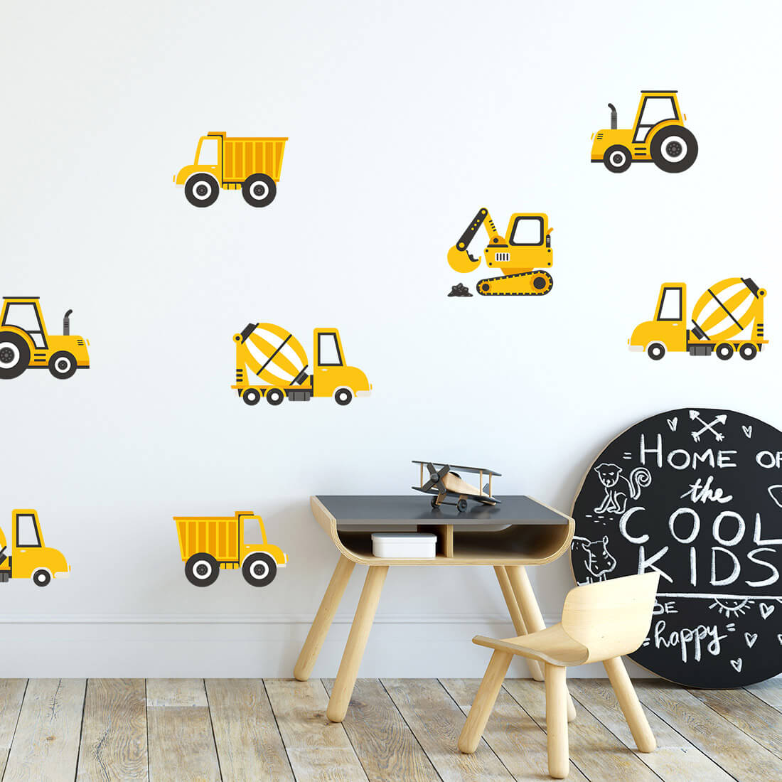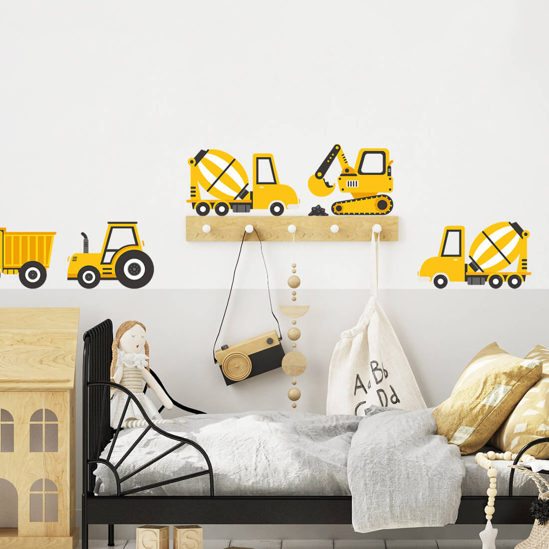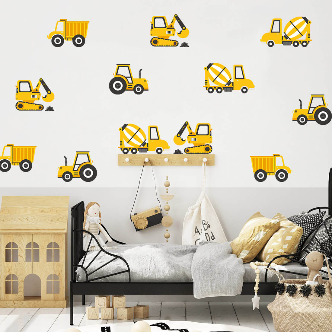 Verwandeln Sie das Zimmer Ihres Kindes in eine echte Baustelle mit einer Reihe von Aufklebern mit Baufahrzeugen.