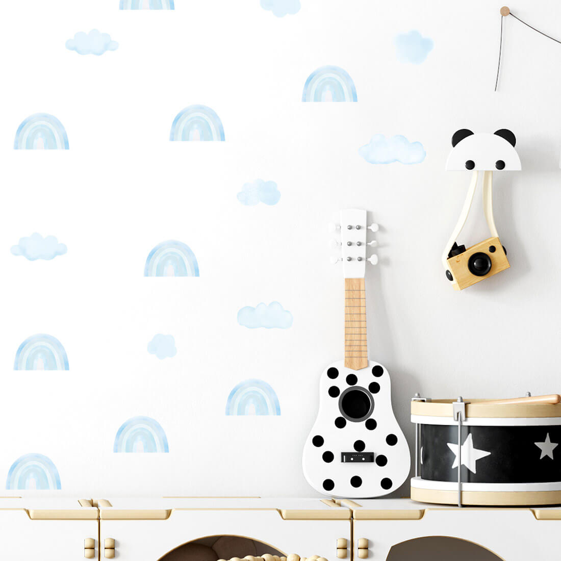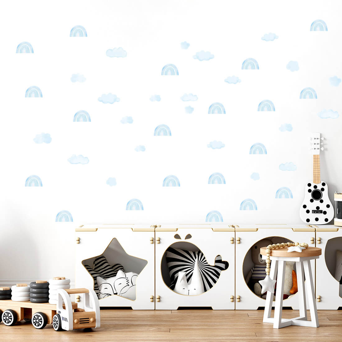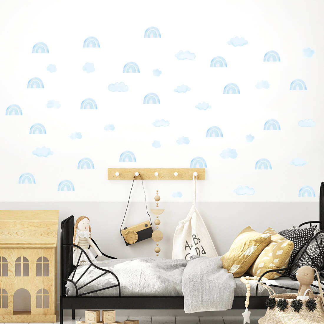 Das Set der Wandtattoos umfasst: 35 Mini-Regenbögen und 23 Wolken.