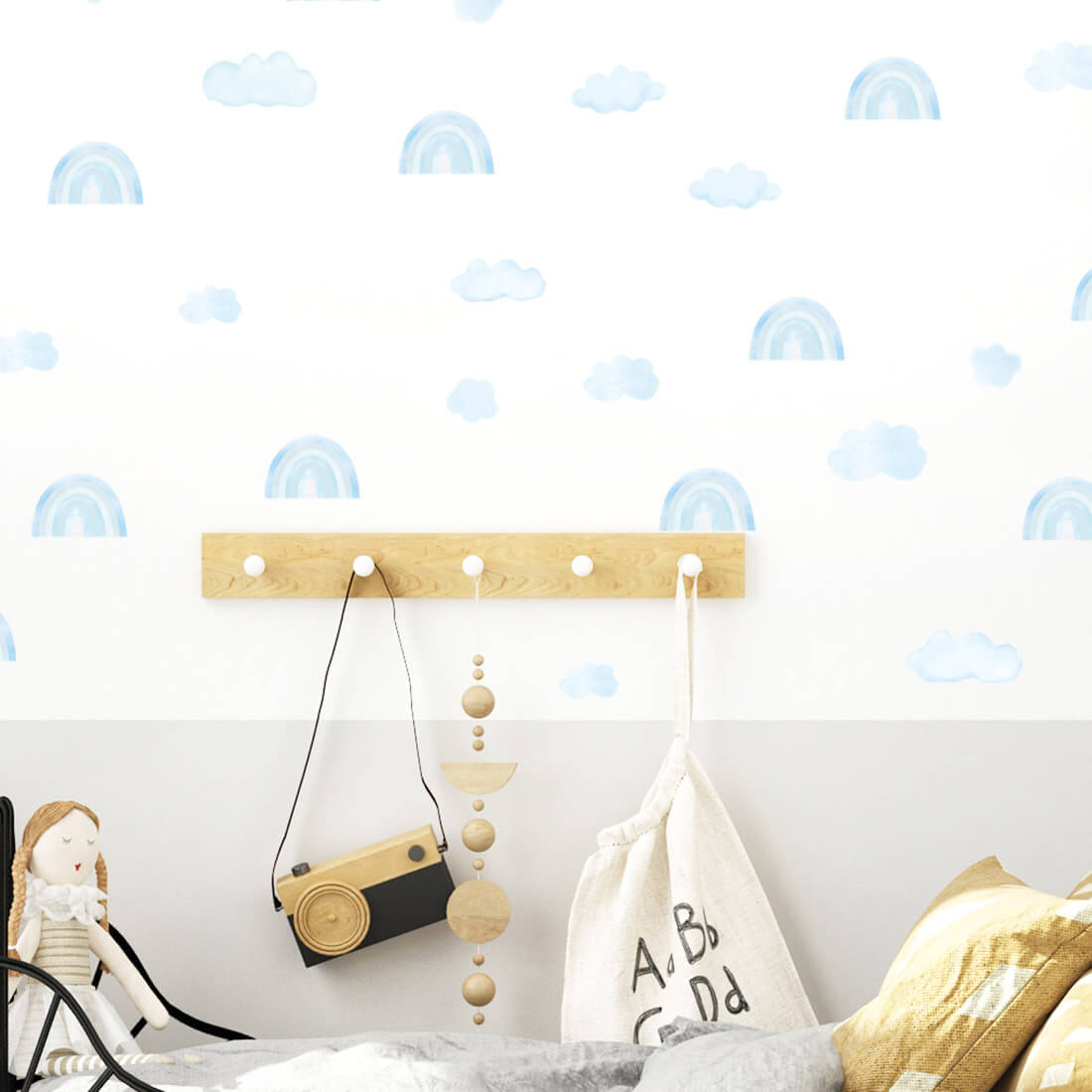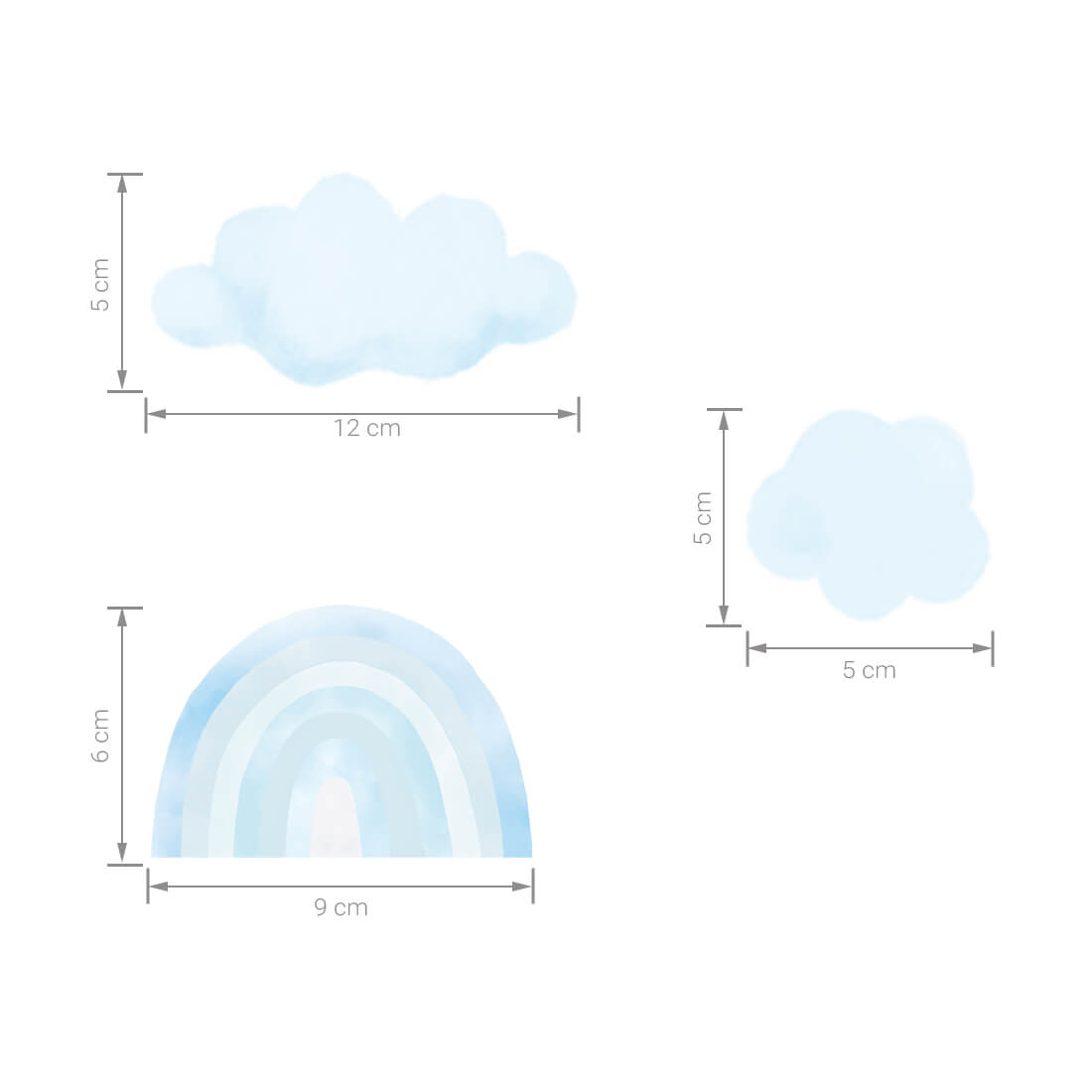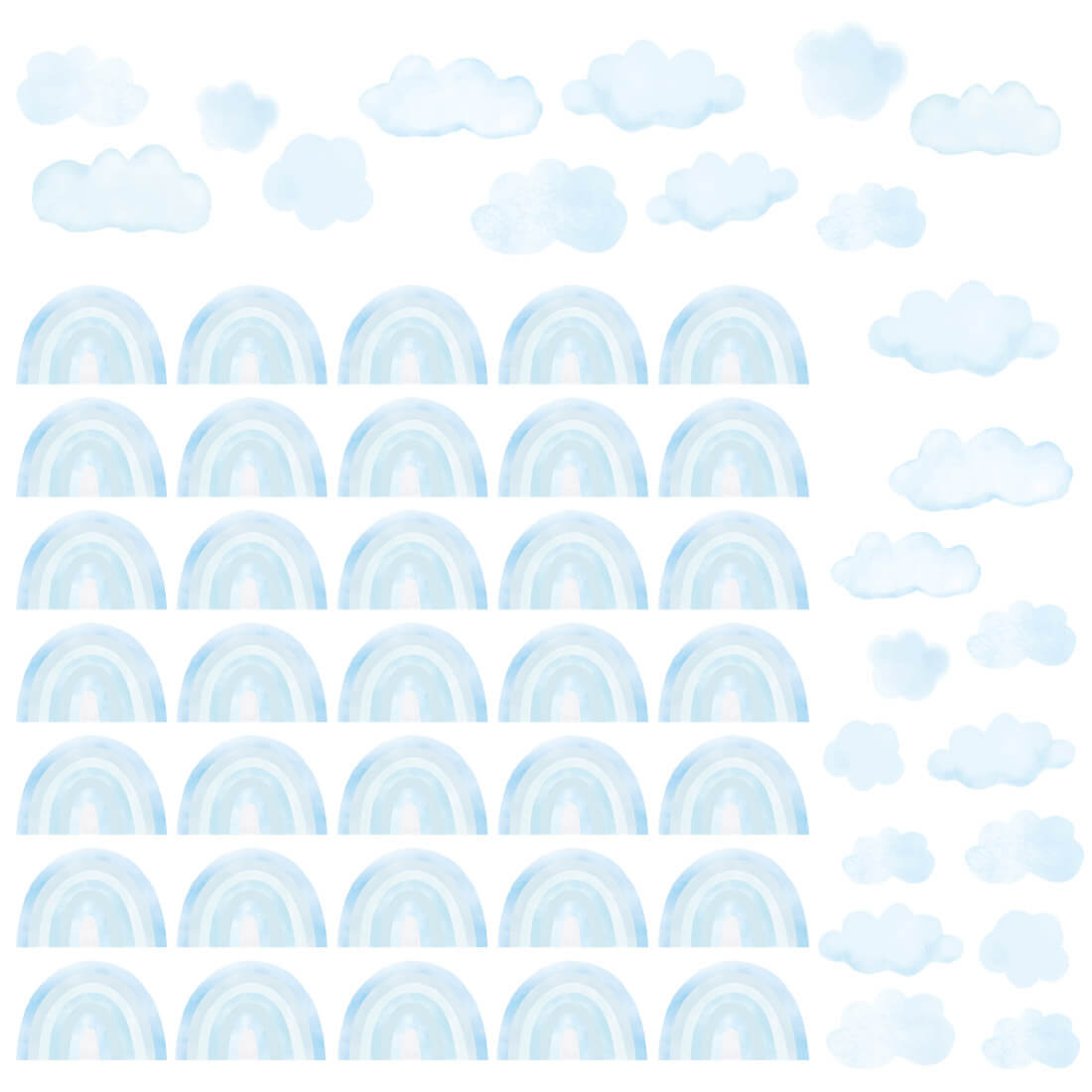 Das Set der Wandtattoos umfasst: 35 Mini-Regenbögen und 23 Wolken.