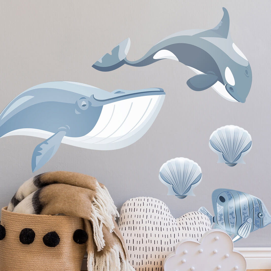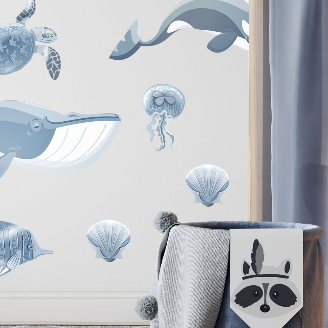 Schaffen Sie eine einzigartige Unterwasserwelt im Kinderzimmer mit den Ozean-Wandstickern – Wal, Schwertwal, Schildkröte, Fische, Quallen und Muscheln.